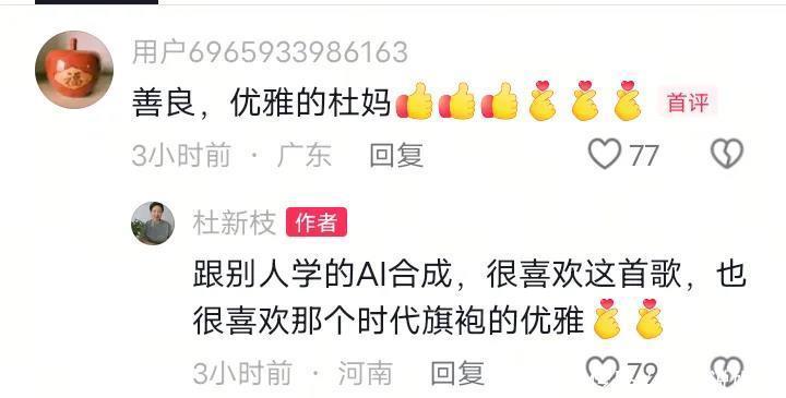 有网友评论区说:老杜你真的是个活宝,你真的是来气人的吧。其实网友们想多了,根本气不到别人,谁都知道这个视频都是怎么生成的,至于本人长什么样?一直关注二八事件的人,基本上都看过老杜的真实面容的。老杜在评论区坦诚:跟别人学的AI合成,很喜欢这首歌,也很喜欢那个时代旗袍的优雅。老杜也喜欢旗袍下的优雅,但是优雅端庄大方,气质都是与之俱来的,无论如何,估计也很难达到那种境地了。